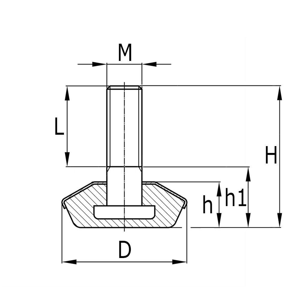 D=Voet-Ø, h=Voethoogte, L=Spindellengte, M=Schroefdraad spindel, Mat.=Materiaal,