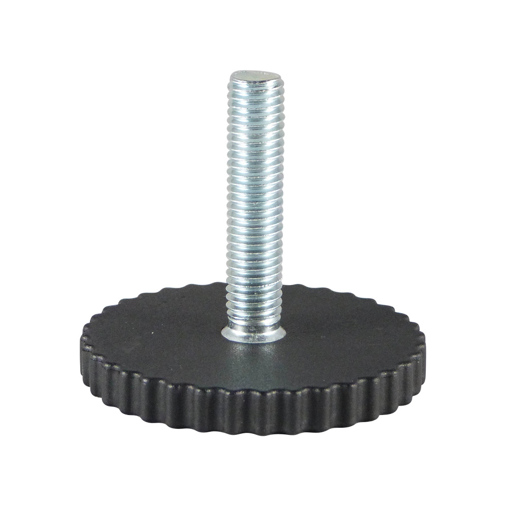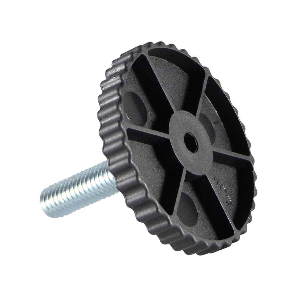 - De grof gekartelde kartelrand bevordert de grip bij het handmatige verstelling van de stelvoet