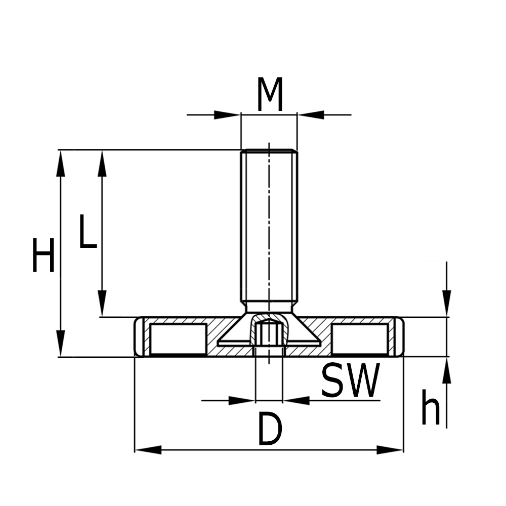 - Stelvoeten met vaste grof gekartelde ronde voet met kartelrand zijn leverbaar met draadspindels van M8 tot en met M10 met draadlengtes van 20mm tot en met 60mm