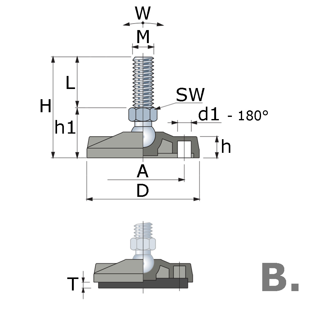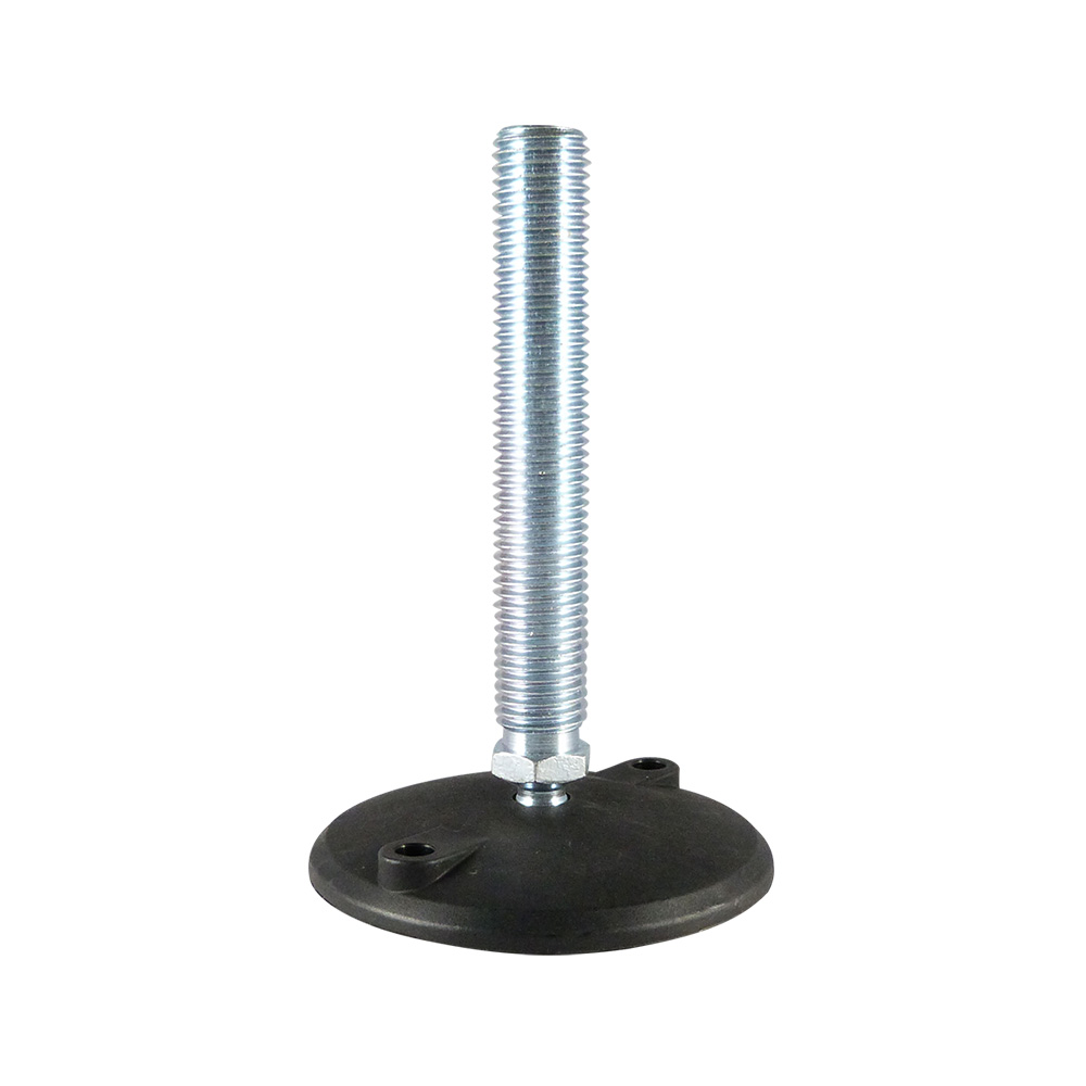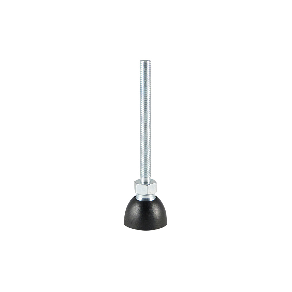 - Stelvoeten met draaibare kunststof voet met kogelgewricht zijn leverbaar met stalen draadspindels van M8 tot en met M24 in lengtes van 40mm tot en met 200mm