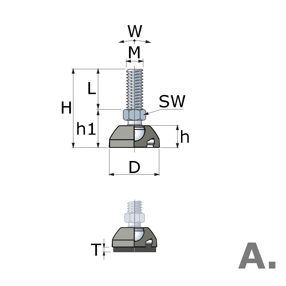 A=Hart op hart afstand bevestigingsgaten, D=Voet-Ø, d=Boring-Ø, H=Hoogte, K=Maximale statische belasting in kg, L=Schroefdraadlengte, M=Schroefdraad, SW=Sleutelwijdte, Type=Uitvoering boringen, W=Maximale opstelhoek in °