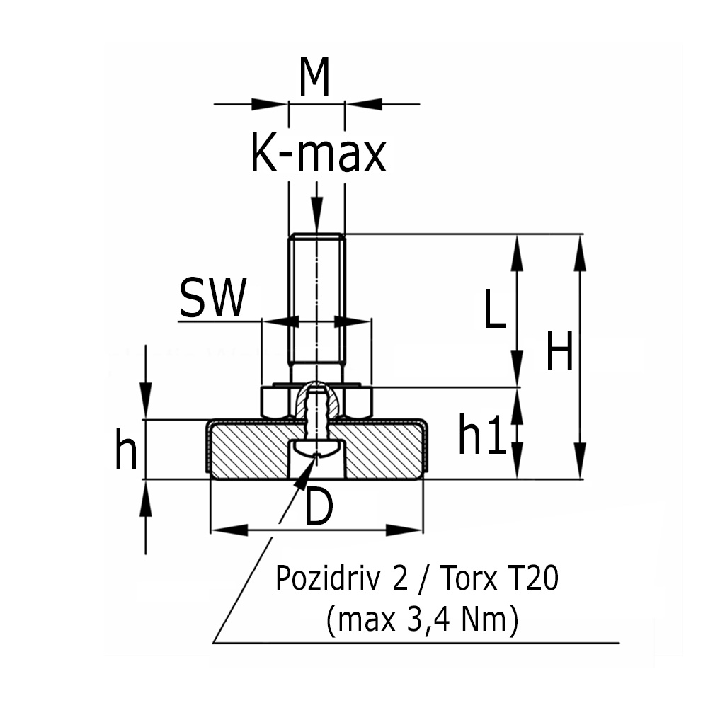 D=Diameter, H=Hoogte voet, H1=Hoogte voet + zeskant, K=Maximale statische belasting in kg, L=Draadlengte, M=Draad, SW=Sleutelwijdte zeskant
