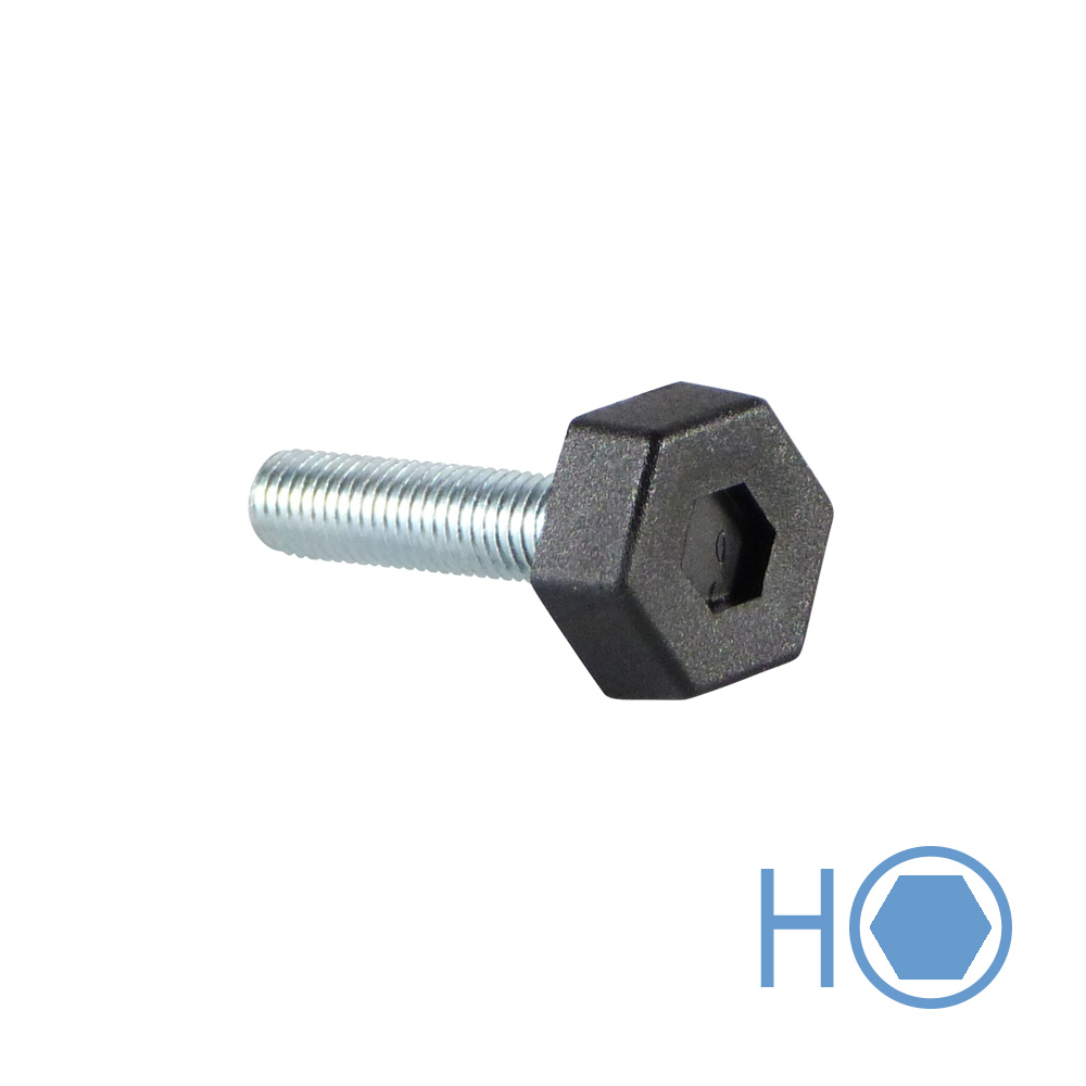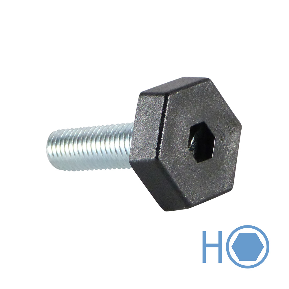 - Stelvoeten met vaste kunststof zeskant voet met binnenzeskant zijn leverbaar met draadspindels in M8 of M10 met effectieve draadlengtes van 16mm tot en met 44mm