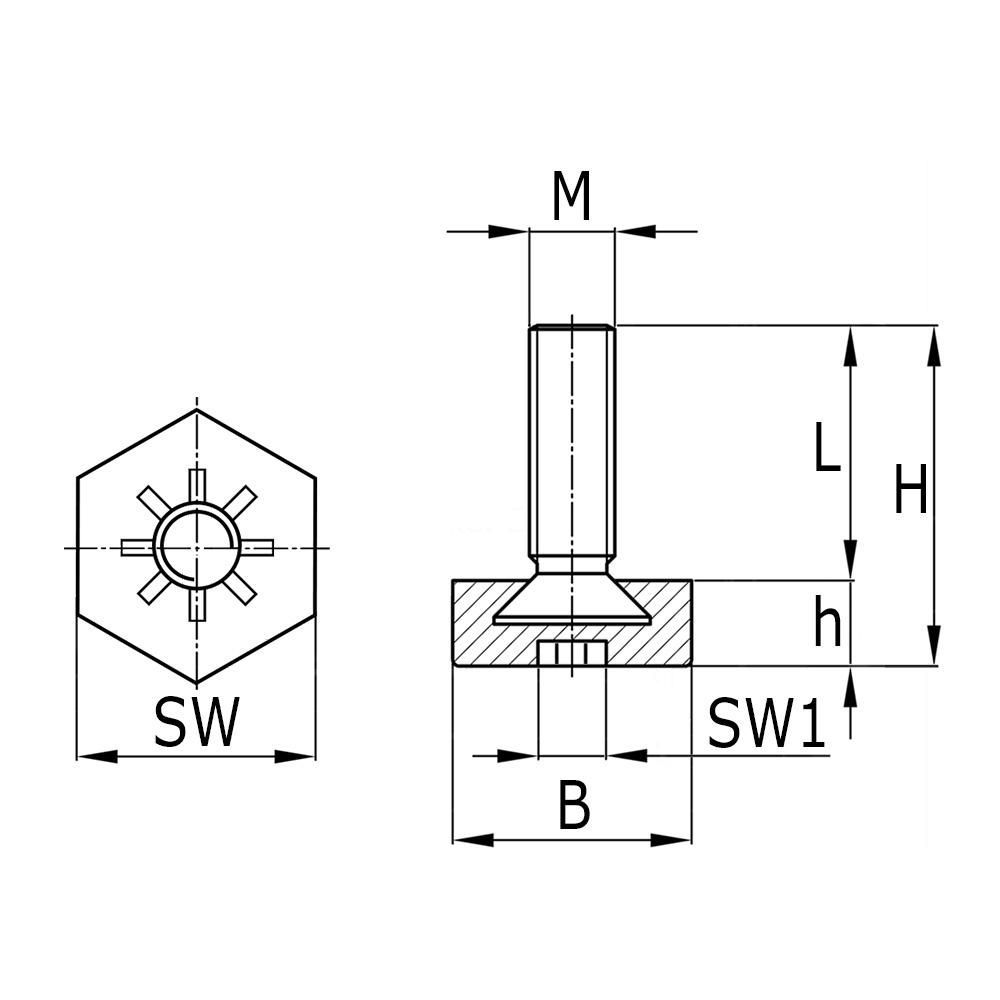 H=Hoogte voet, L=Effectief bruikbare draadlengte, M=Draadspindel, SW=Sleutelwijdte, SW1=sleutelwijdte Inbus