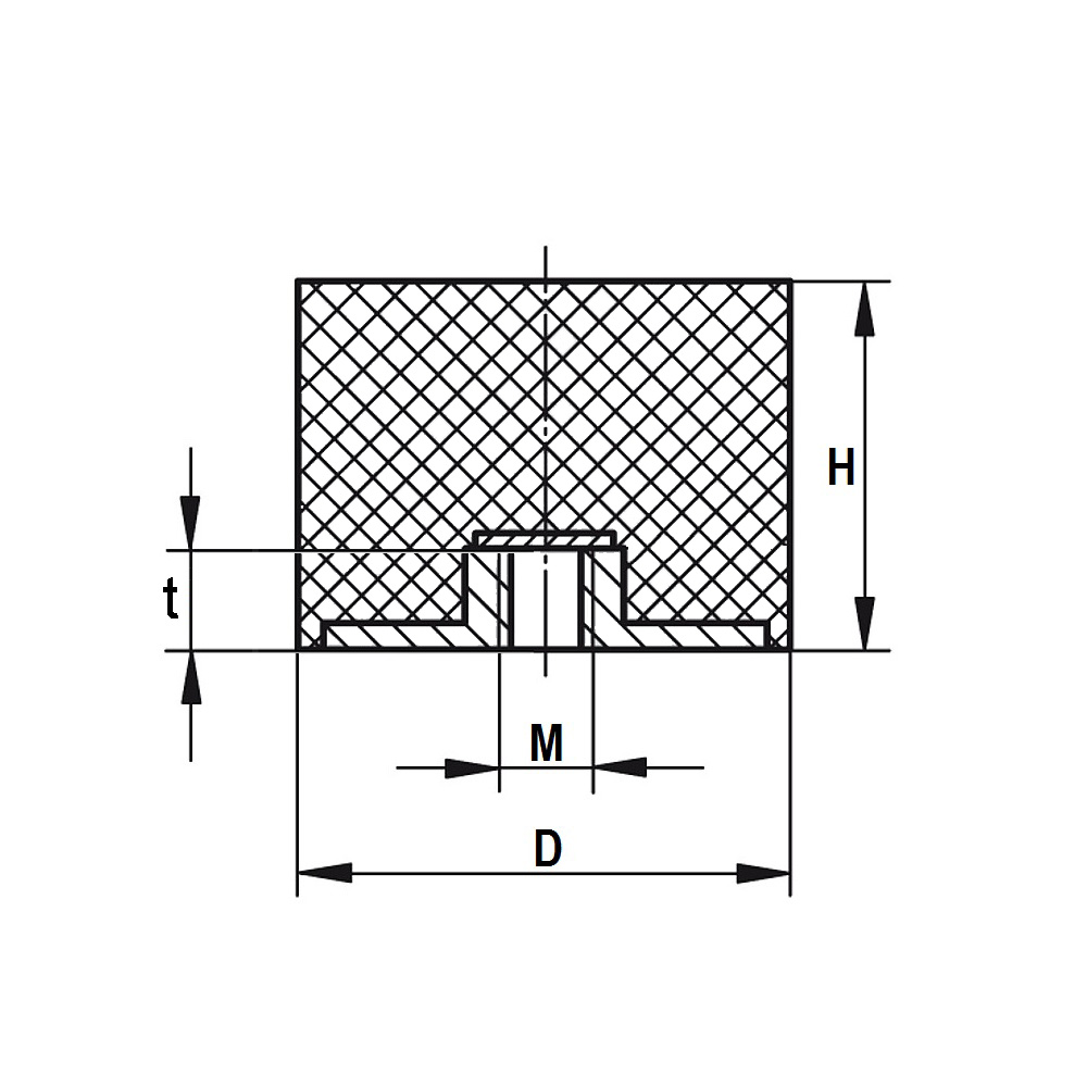 D=Diameter, H=Hoogte, M=Schroefdraad, Mat. A=Rubbersoort, Mat. B=Materiaal metaaldelen, N=Maximale statische belasting in Newton, Shore A °=Shore A hardheid rubber, t=Draaddiepte