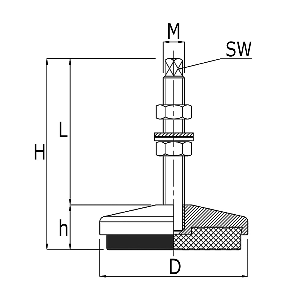 D=Voet-Ø, H=Totale hoogte, h=Voet hoogte, L=Spindellengte, M=Schroefdraadmaat, Shore A °=Shore A hardheid rubber, SW=Sleutelwijdte in mm