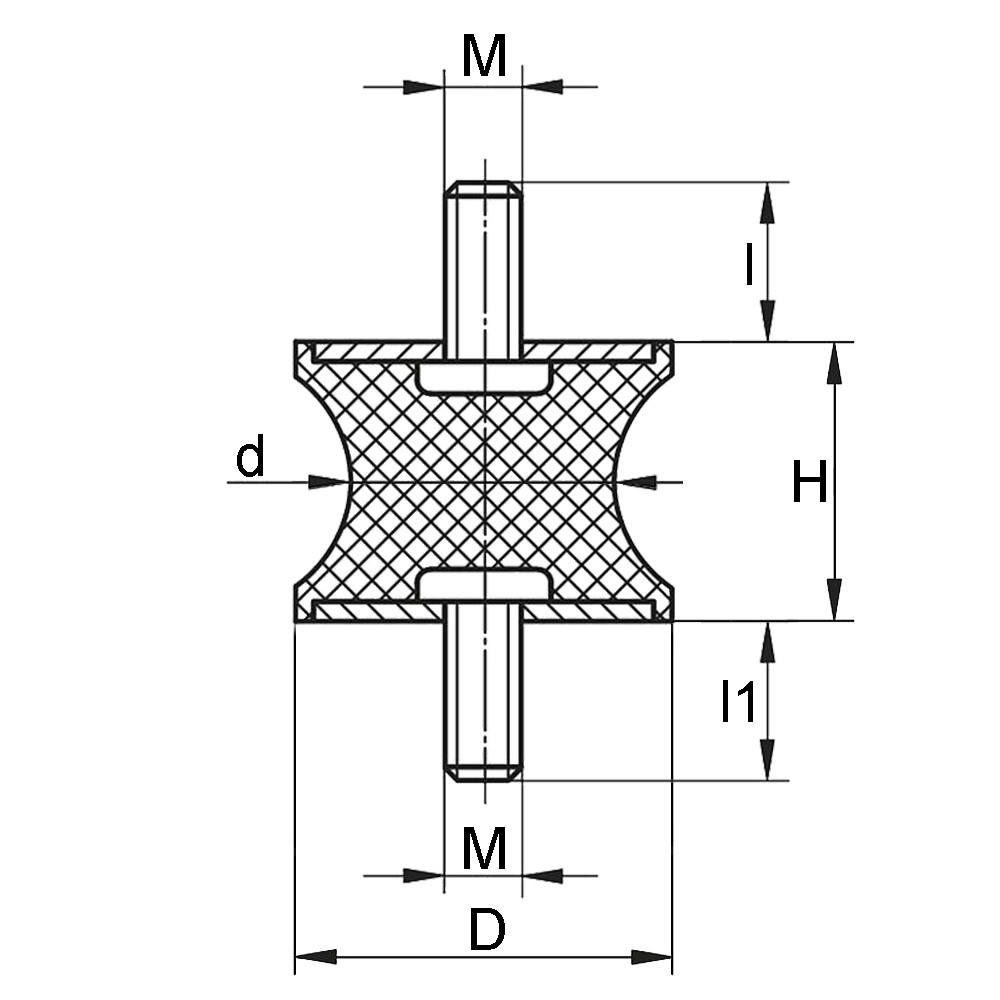 D=Grote-Ø, d=Taille-Ø, H=Hoogte, l=Draadlengte, l1=Draadlengte, M=Draad, Mat. A=Rubbersoort, Mat. B=Materiaal metaaldelen, N=Maximale statische belasting in Newton, Shore A °=Shore A hardheid rubber