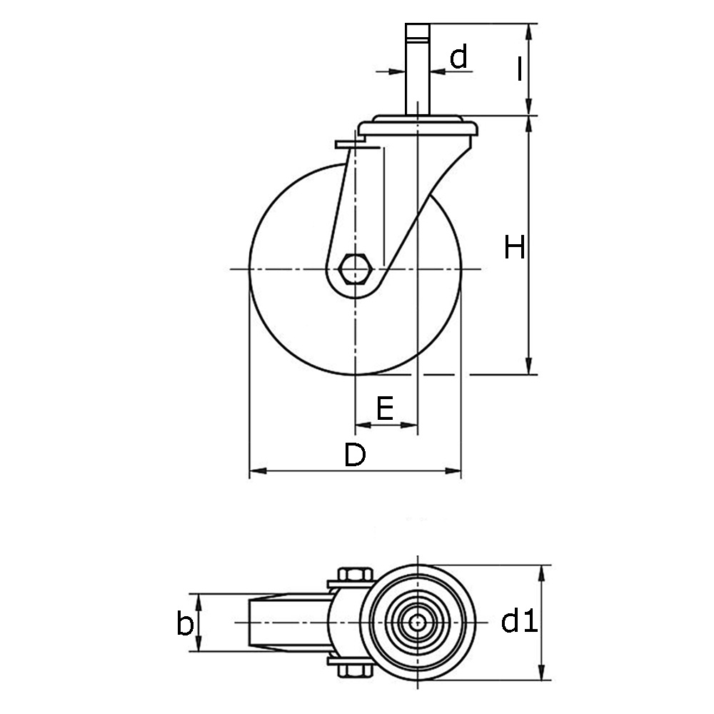 b=Breedte loopvlak, D=Ø-Wiel, d=Ø-boring, E=Uitslag, H=Bouwhoogte, K= Max. statisch draagvermogen in kg bij 3 km/h, Type=Type wiellagering