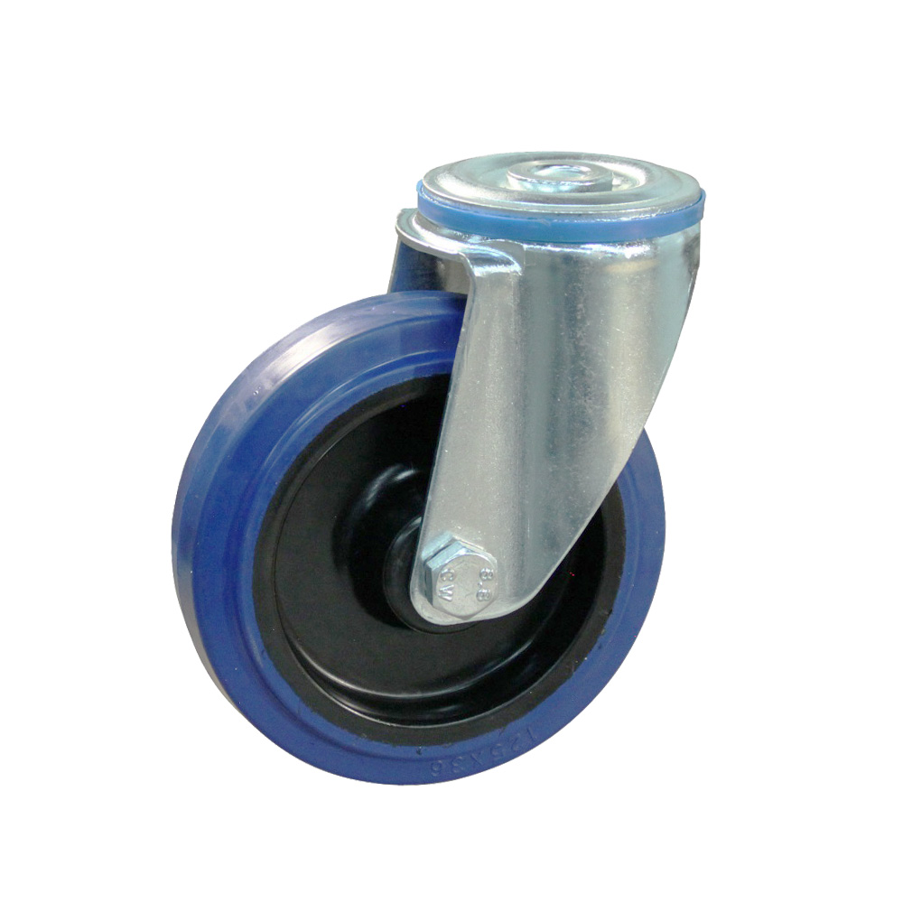 - Zwenkwielen met boutgat bevestiging en blauwe band zijn leverbaar in wielmaten Ø100mm of Ø125mm