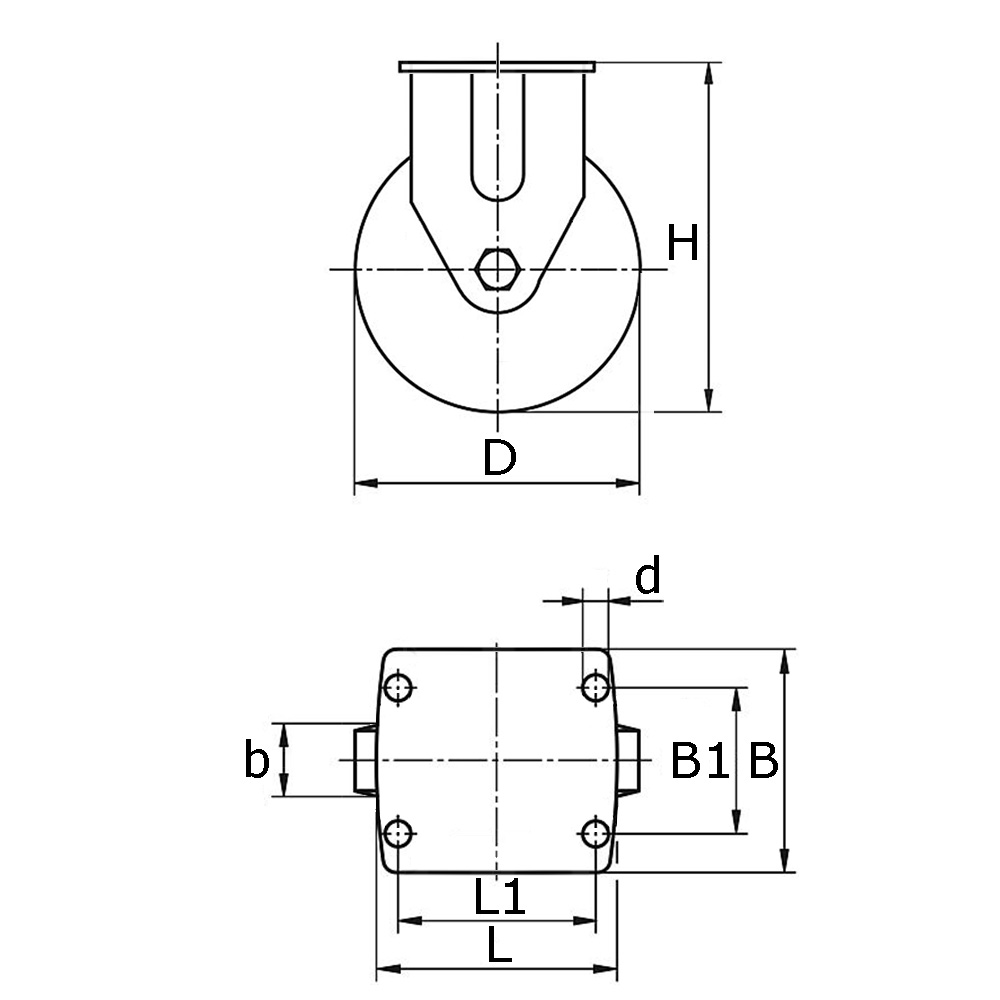 B=Breedte montageplaat, b=Breedte loopvlak, B1=Hartafstand boring, D=Ø-Wiel, d=Ø-boring, H=Bouwhoogte, K= Max. statisch draagvermogen in kg bij 3 km/h, L=Lengte montageplaat, L1=Hartafstand boring, Type=Type wiellagering