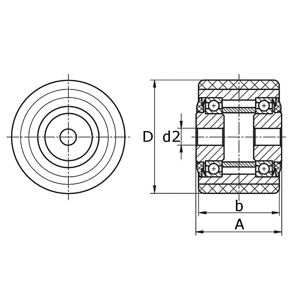 A=Naafbreedte, b=Breedte loopvlak, D=Ø-Wiel, d2=Ø-asgat, K= Max. statisch draagvermogen in kg bij 3 km/h, Type=Type wiellagering