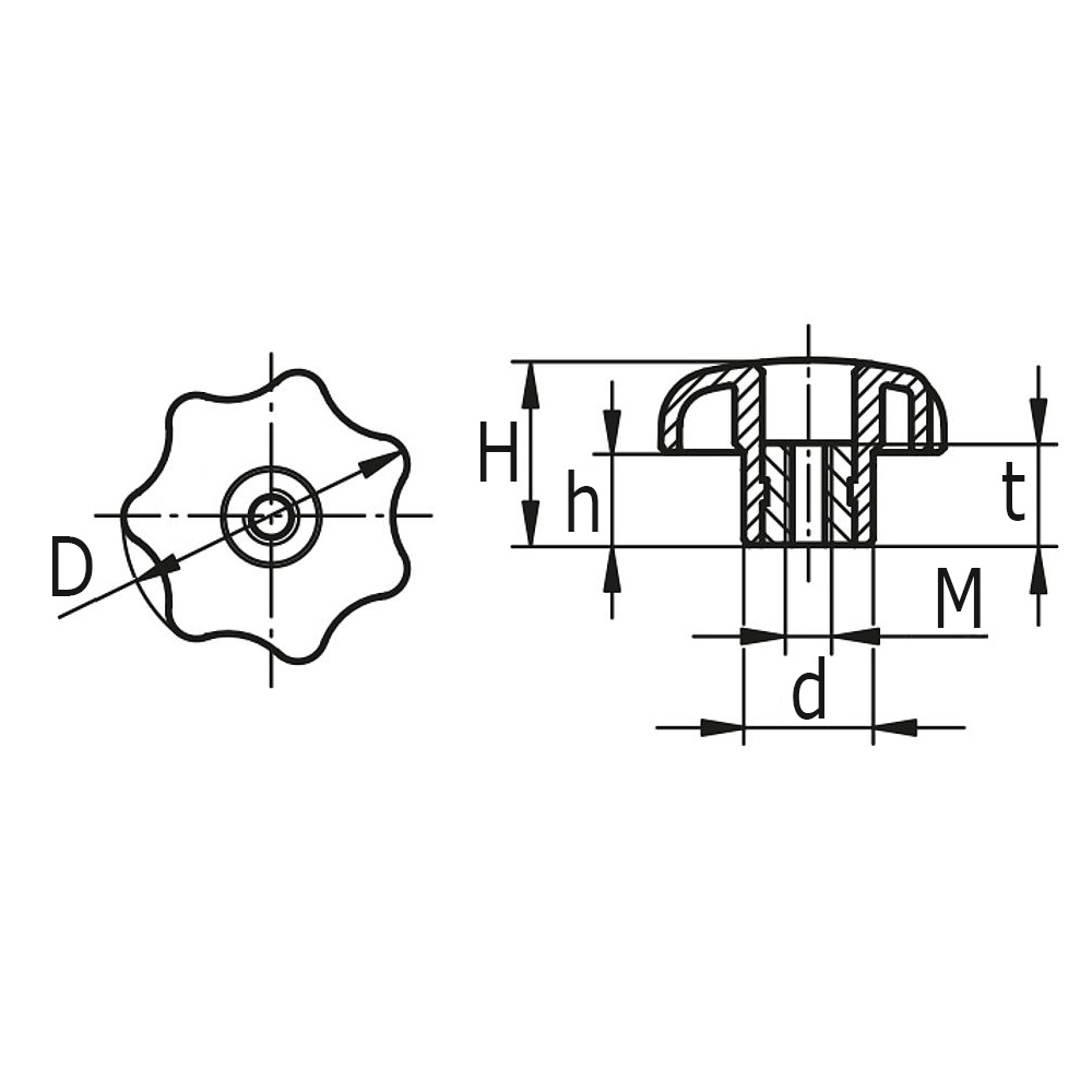 D=Knop-Ø, d=Schaft-Ø, H=Totale hoogte, h=Hoogte, M=Schroefdraad, Type=Materiaal draadbus