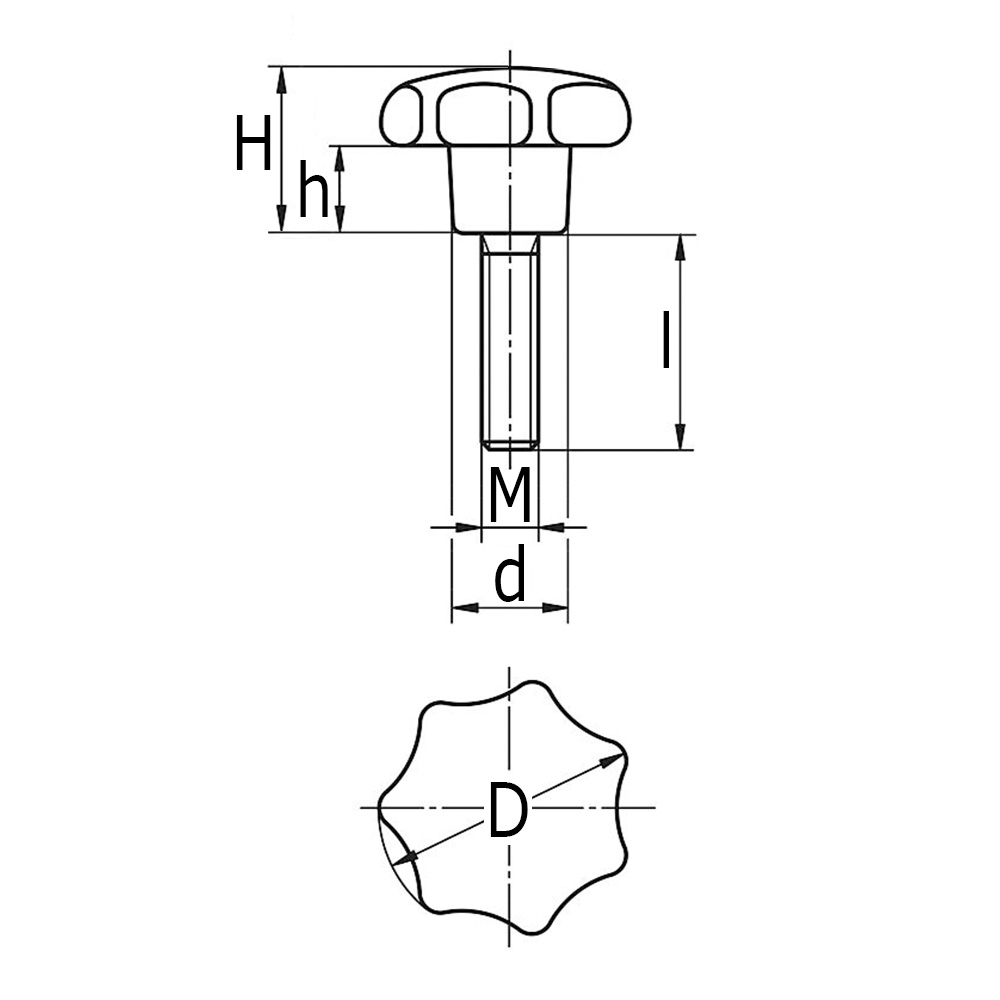 D=Knop-Ø, d=Schaft-Ø, H=Totale hoogte, h=Hoogte, l=Lengte schroefdraad, M=Schroefdraad, Type=Materiaal draadbus
