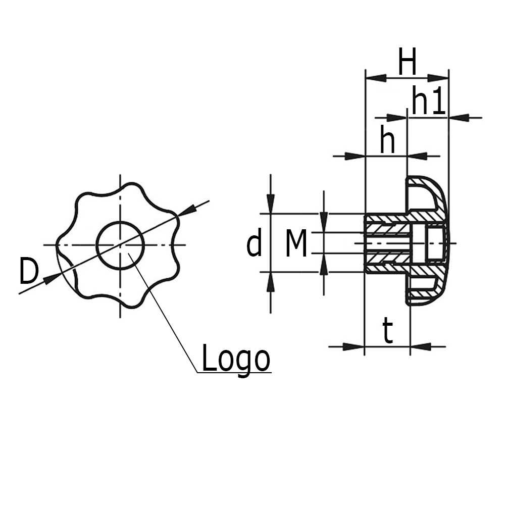 D=Knop-Ø, d=Schaft-Ø, H=Totale hoogte, h=Hoogte, h1=Hoogte, M=Schroefdraad, t=Diepte draadbus