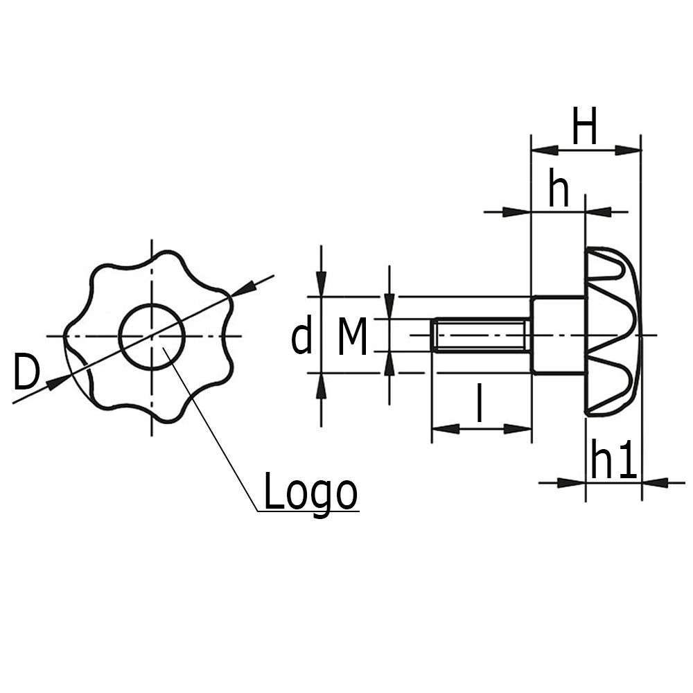 D=Knop-Ø, d=Schaft-Ø, H=Totale hoogte, h=Hoogte, h1=Hoogte, l=Schroefdraadlengte, M=Schroefdraad