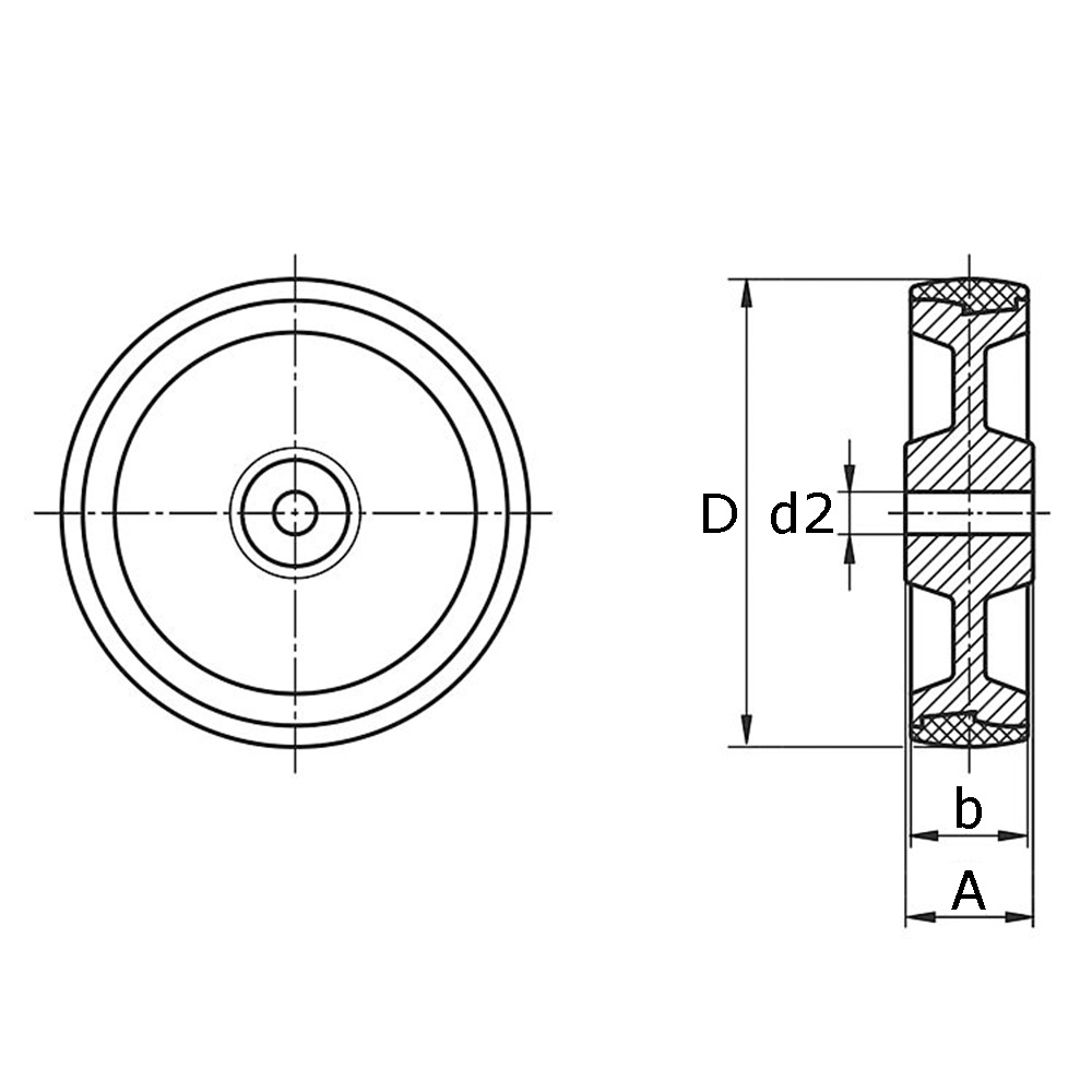 A=Naafbreedte, b=Breedte loopvlak, D=Ø-Wiel, d2=Ø-asgat, K=Max. statisch draagvermogen in kg bij 3 km/h, Type=Type wiellagering