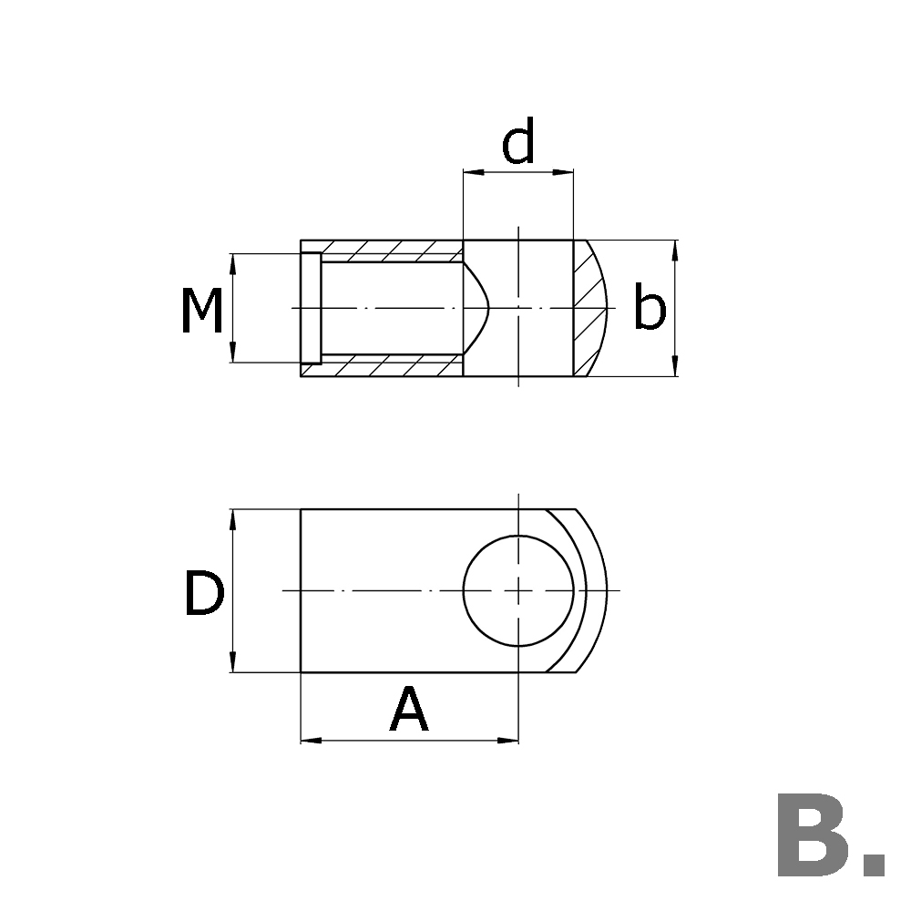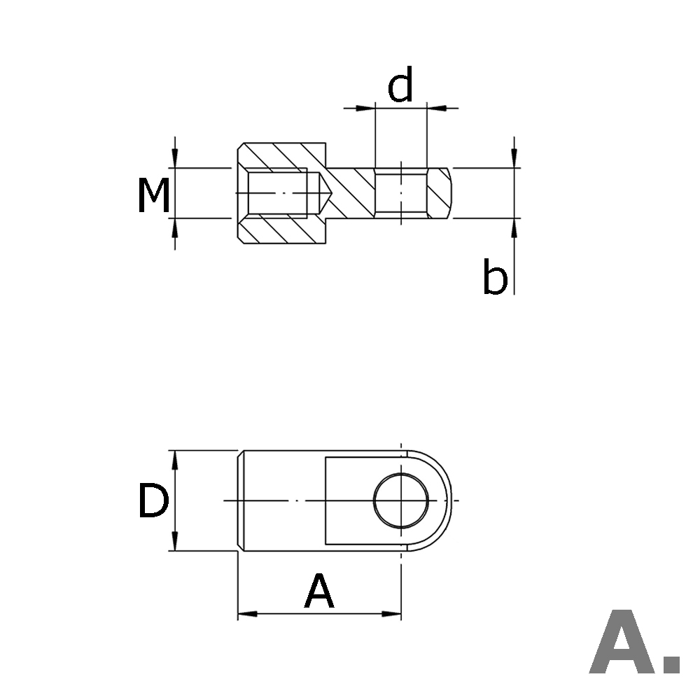 A=Installatie lengte, b=Breedte, D=Uitwendige-Ø, d=Boring-Ø, M=Schroefdraadmaat metrisch, Uitv.=Model oog, Type=Aanduiding type oog