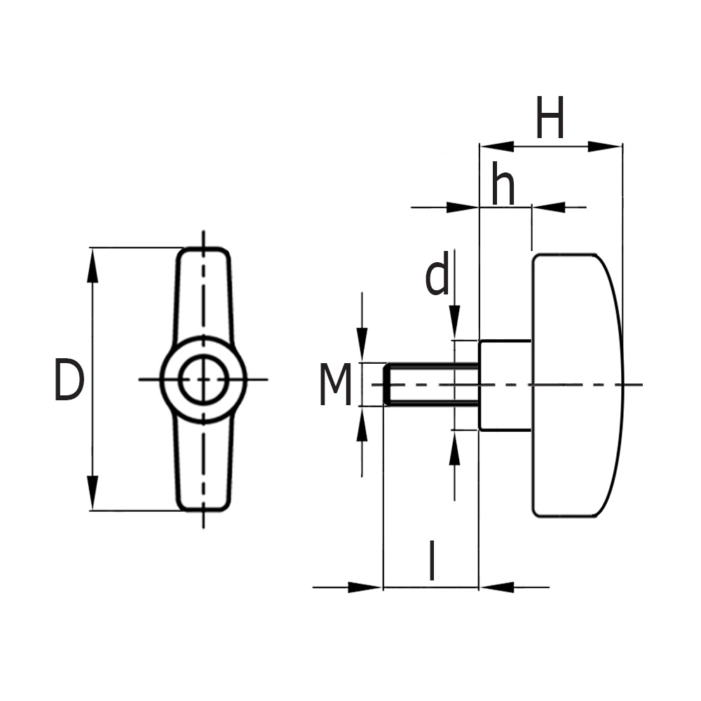 D=Knoplengte, d=Flens-Ø, H=Hoogte, h=Kraag hoogte, l=Draadlengte, M=Schroefdraad