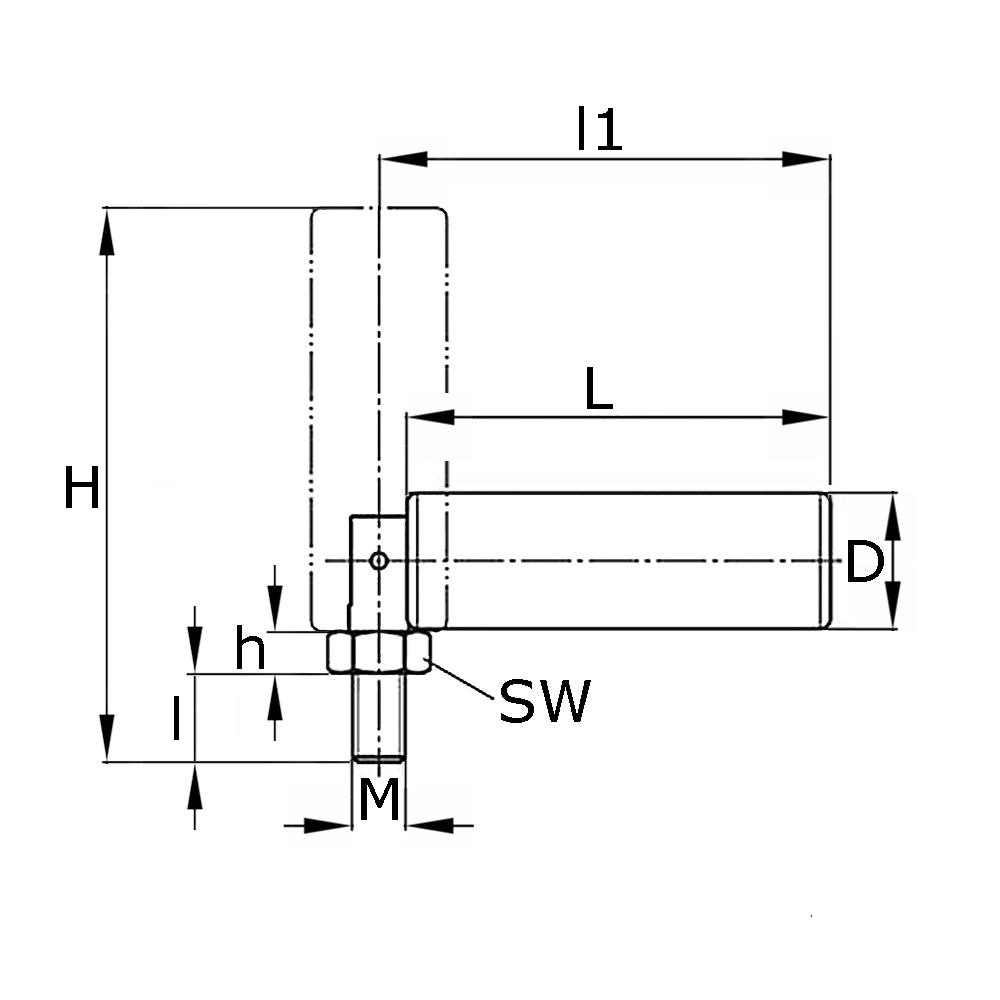 D=Greep-Ø-groot, d=Hoogte zeskantmoer, L=Greeplengte, l=Draadlengte, M=Schroefdraad, SW=Sleutelwijdte