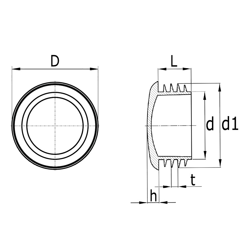 Buisafmeting=Uitwendige buismaat, D=Kop-Ø, d=Schaft-Ø, d1=Lamellen-Ø, h=Kophoogte, L=Schaftlengte, t=Lamellenafstand, Uitv=Wanddikte buis