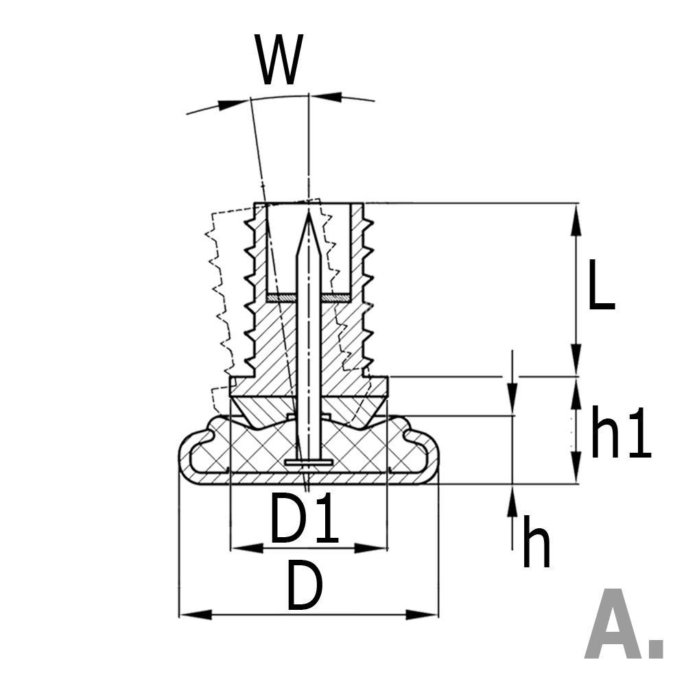 Buisafmeting=Uitwendige buismaat, D=Voet-Ø, D1=Kraag-Ø, h=Hoogte voet, h1=Kogelgewricht +voet, L=Schaftlengte, Uitv=Wanddikte buis, W=Maximale standhoek in °