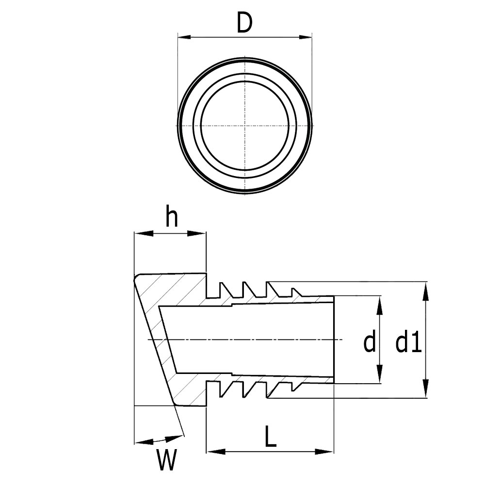 Buisafmeting=Uitwendige buismaat, D=Voet-Ø, d=Schaft-Ø, d1=Lamellenmaat, h=Voethoogte, L=Schaftlengte, Uitv=Wanddikte buis, W=Standhoek in °