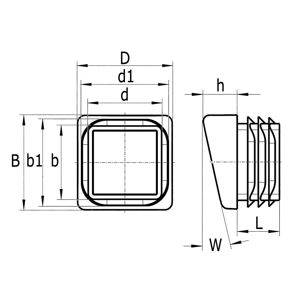B=Breedte kop, bxd=Schaftmaten, b1xd1=Lamellenmaten, Buisafmeting=UItwendige kokermaat, D=Lengte kop, h=Hoogte kop, L=Lengte Schaft, Uitv.=Wanddikte koker, W=Standhoek in °