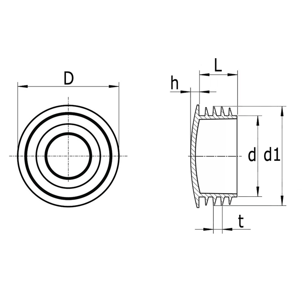 Buisafmeting=Uitwendige buis-Ø, D=Kop-Ø, L=Schaftlengte, h=Kophoogte, t=Lamellenafstand, Uitv.=Wanddikte buis