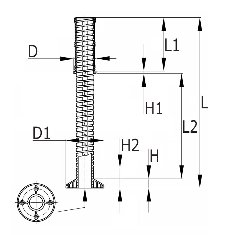 Buisafm.=Uitwendige buismaten, D=Kraag-Ø, D1=Voet-Ø, H=Voethoogte, H1=Kraagdikte, H2=Min. hoogte bij ingedraaide spindel, K=Maximaal statisch draagvermogen in kg, L=Totale lengte, L1=Schaftlengte, L2=Verstelbereik, Uitv.=Wanddikte