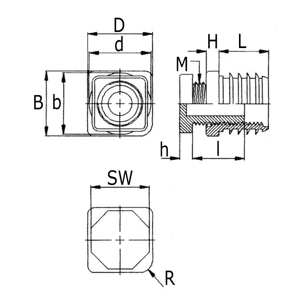 BxD=Kopmaat indop, bxd=Lamellenmaten, Buisafm.=Uitwendige buismaten, H=Kopdikte, h=Voetdikte, K=Maximale statische belastbaarheid in kg, L=Schaftlengte, l=Lengte Draadspindel, M=Schroefdraadmaat, SW=Sleutelwijdte zeskantvoet, Type=Tekening, R=Radius, Uitv.=Wanddikte