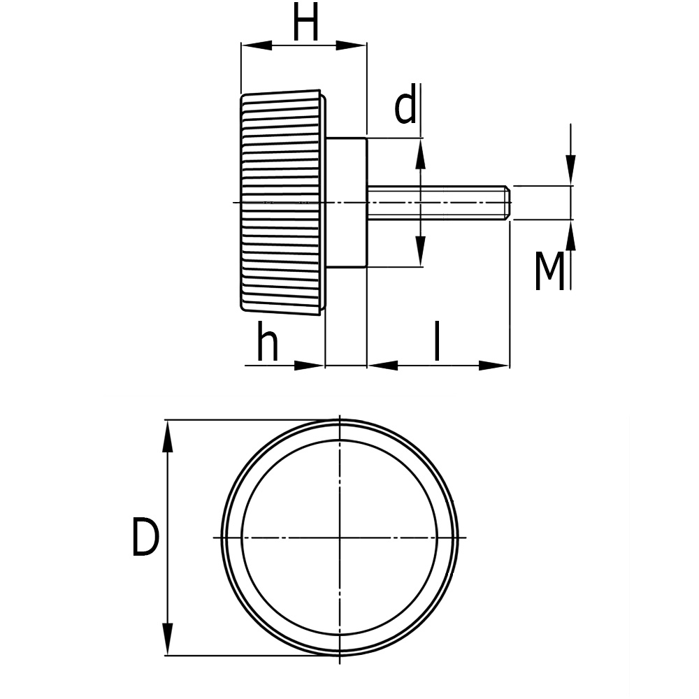 D=Knop-Ø, d=Schaft-Ø, h=Knophoogte, h1=Schafthoogte. l=Schroefdraadlengte, M=Schroefdraad
