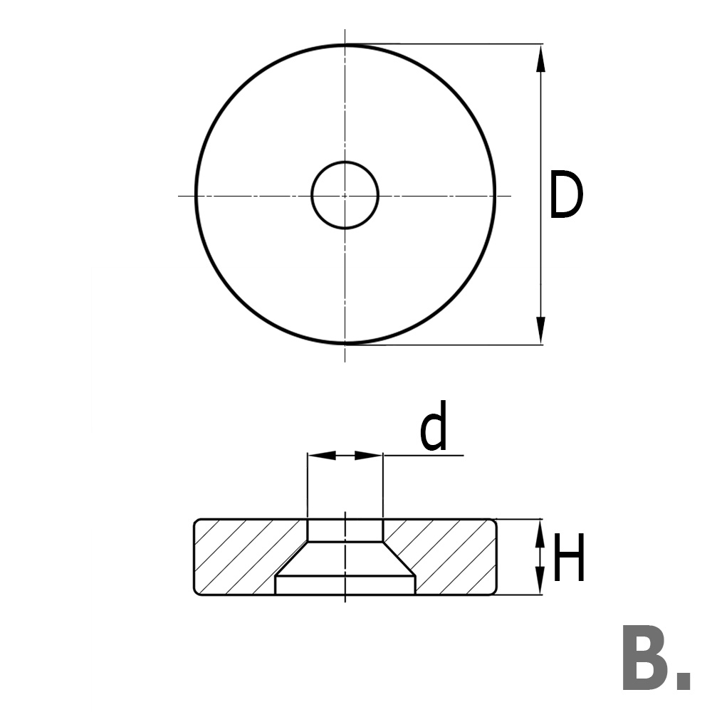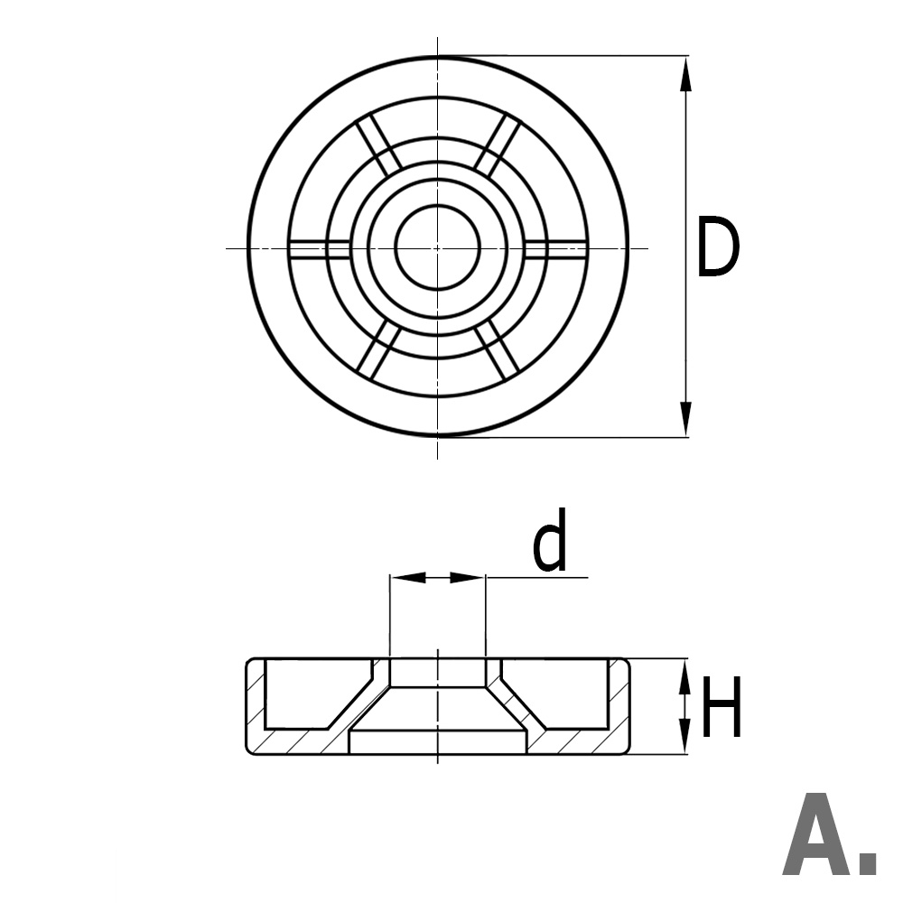 D=Uitwendige-Ø, d=Boring-Ø, H=Hoogte, Type=Uitvoering PA/PE