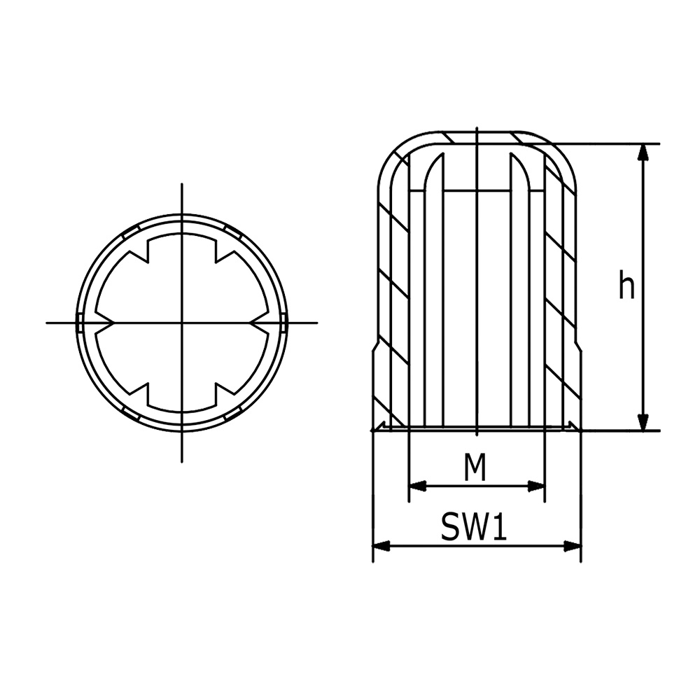 h=Totale inwendige hoogte, M=Schroefdraadmaat Metrisch, SW1=Sleutelwijdte