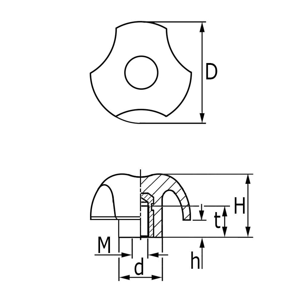 D=Knop-Ø, d=Naaf-Ø, H=Hoogte, h=Hoogte, M=Schroefdraad, t=Lengte draadbus