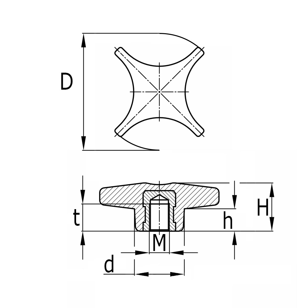 D=Knop-Ø, d=Kraag-Ø, h=hoogte, M=Schroefdraad