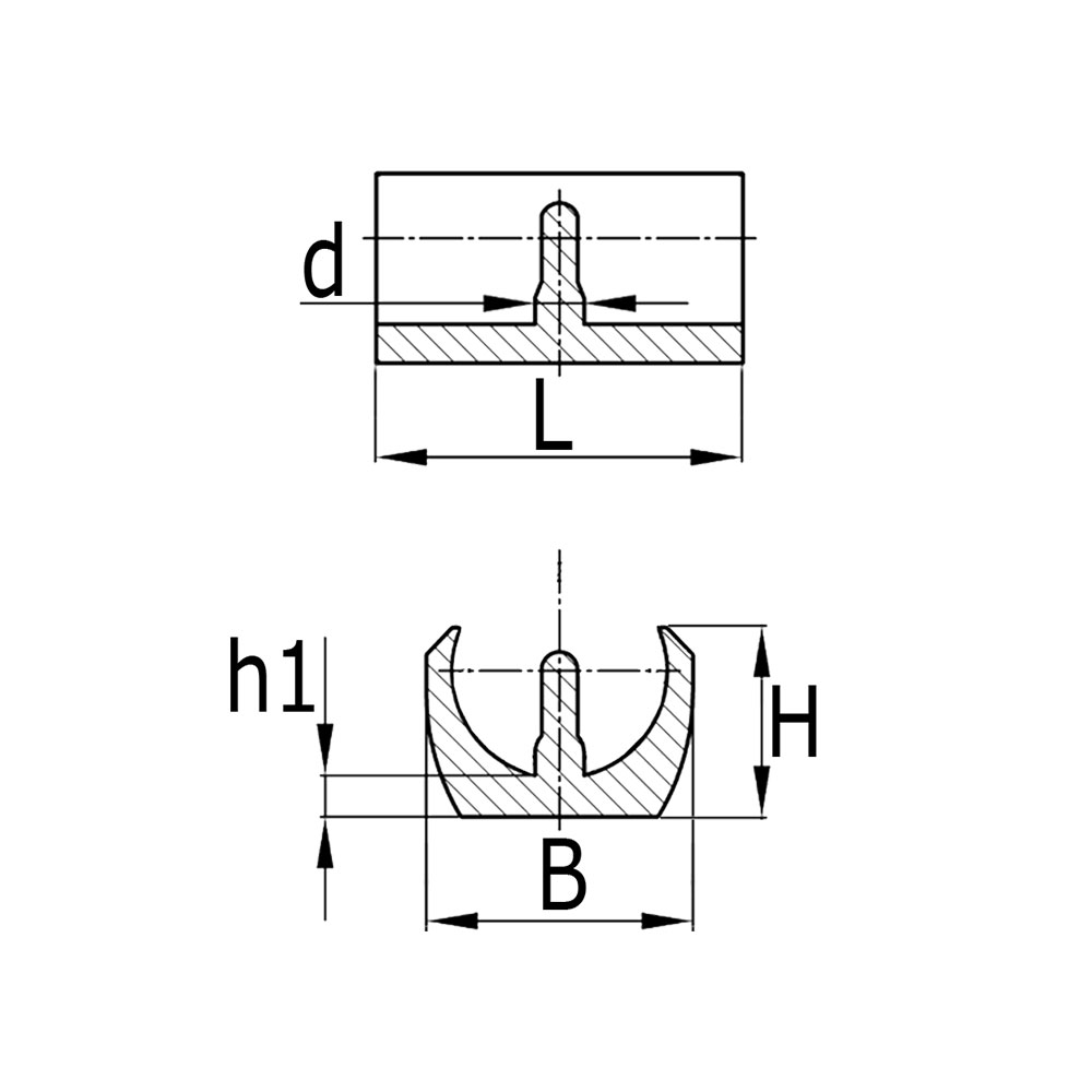 Buisafm.=Uitwendige buis-Ø, B=Breedte voet, d=Stift-Ø of Boring-Ø, H=Totale hoogte, h1=Dikte voet, L=Lengte voet, Type=Uitvoering