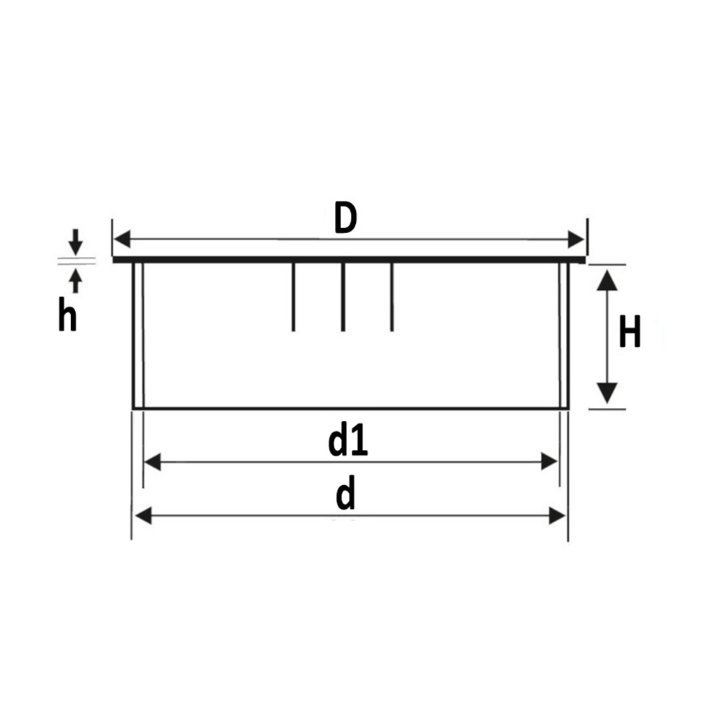 Boring=Ø-Montagegat, D=Ø-Kop, d=Ø-Schacht, d1=Ø-doorvoergat, H=Schacht hoogte, h=Hoogte dekplaat