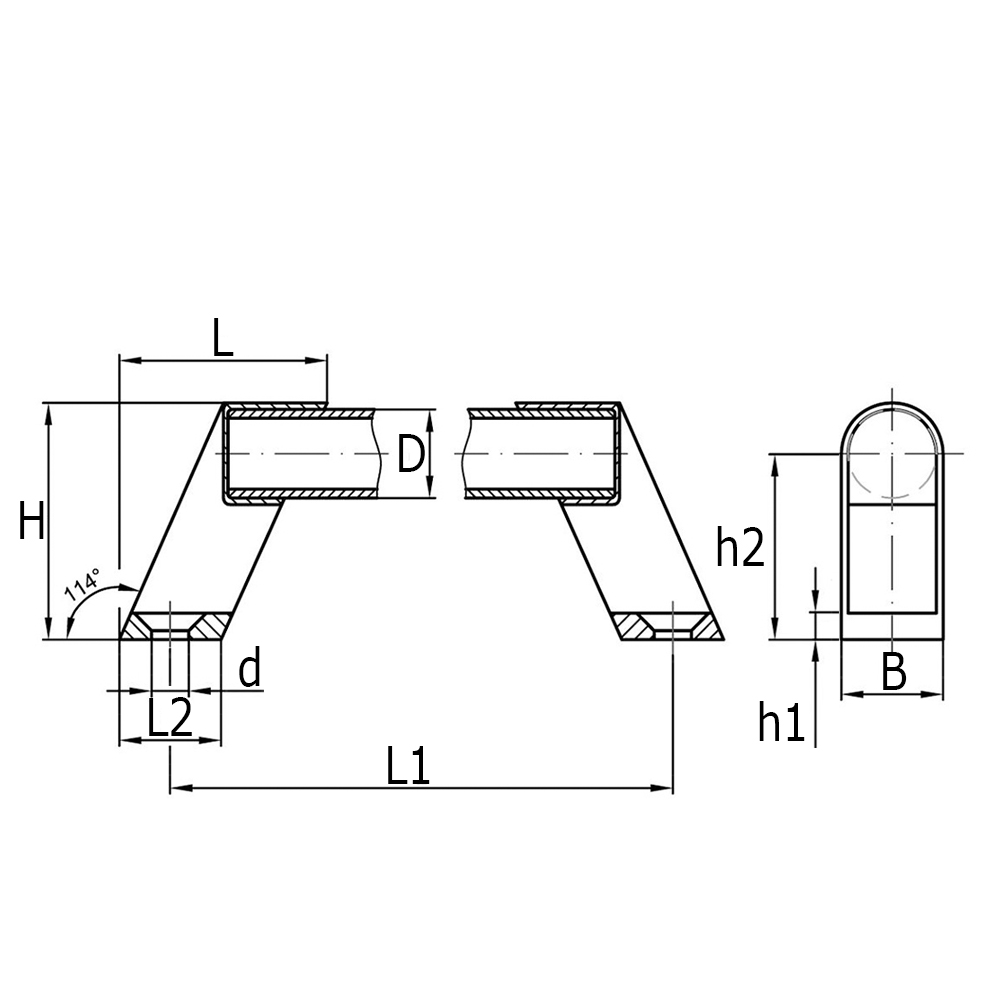 B=Breedte, D=Buis-Ø, d=Boring-Ø, H=Hoogte, h1=Hoogte, h2=Hoogte, L=Lengte eindstuk, L1= Hart op hart maat boringen +/-1mm, L2=Lengte